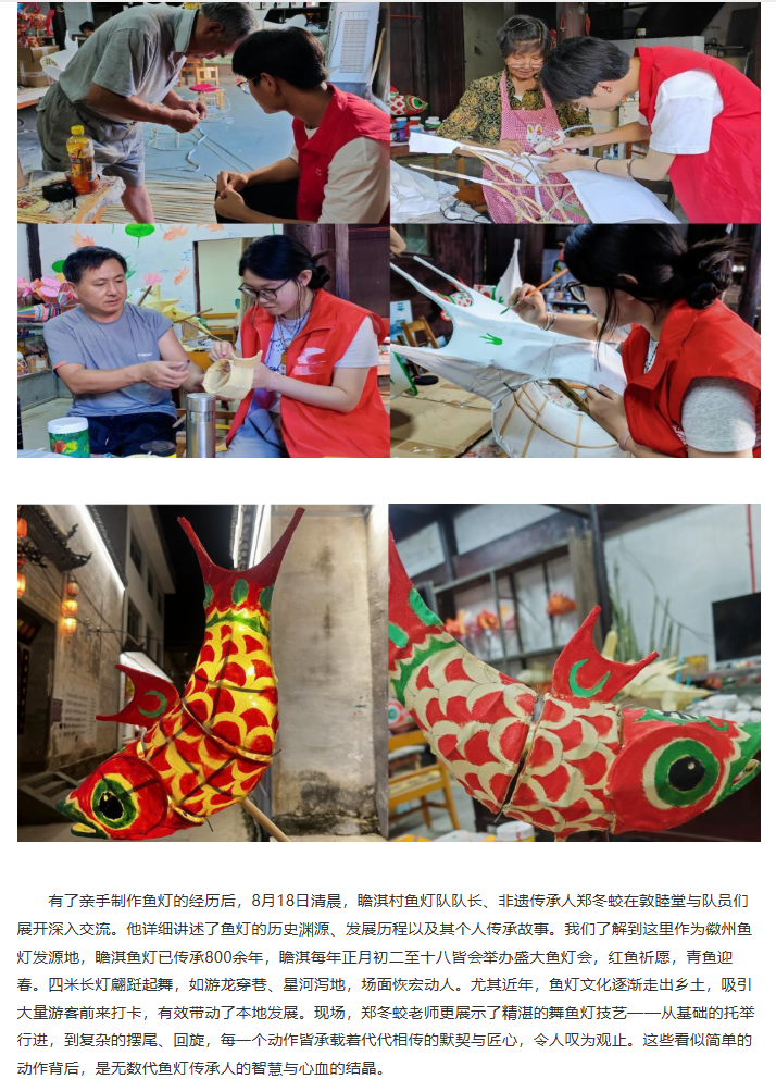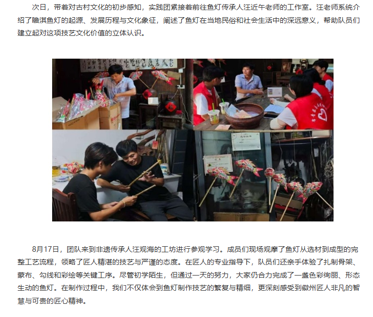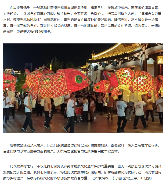 为探寻在瞻淇古村的夜色中流转不息的那缕匠心与乡魂,揭示鱼灯光影背后跃动的文化脉搏,推动传统技艺焕发新活力。近日,诸侯快讯入口官网经济与管理学院赴瞻淇村进行非遗鱼灯技艺研习与传播暑期社会实践团开展了为期六天的暑期“三下乡”社会实践活动。团队通过采访调研、实地参观和技艺体验等多种形式,全面深入了解瞻淇鱼灯这一非物质文化遗产的传承现状与发展路径,积极为非遗传承与乡村振兴注入青春动能。对此,中国日报网进行了报道: