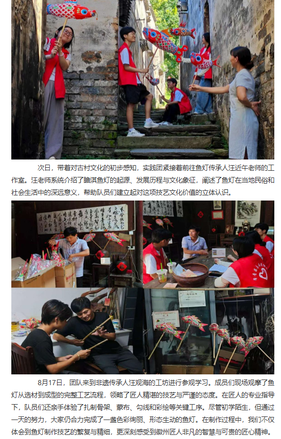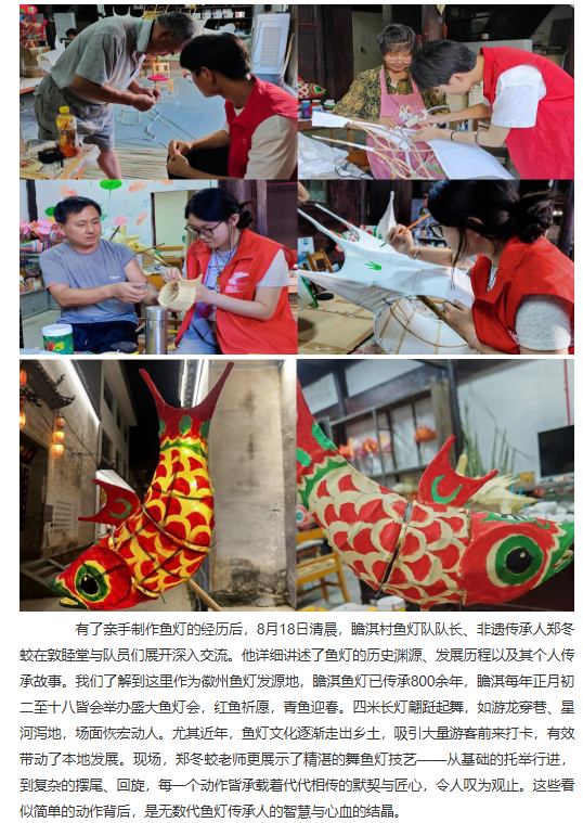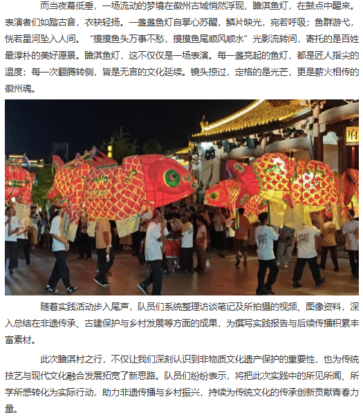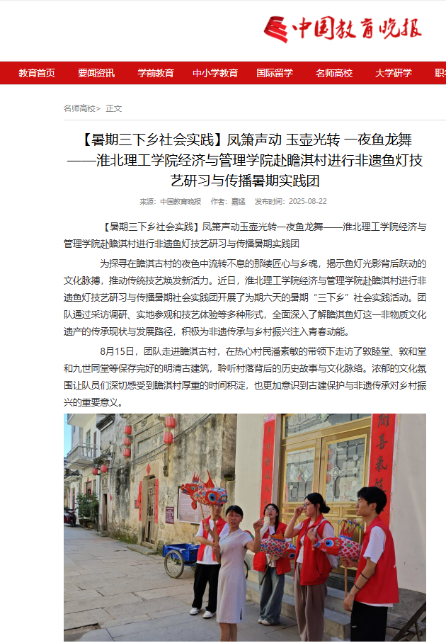 为探寻在瞻淇古村的夜色中流转不息的那缕匠心与乡魂,揭示鱼灯光影背后跃动的文化脉搏,推动传统技艺焕发新活力。近日,诸侯快讯入口官网经济与管理学院赴瞻淇村进行非遗鱼灯技艺研习与传播暑期社会实践团开展了为期六天的暑期“三下乡”社会实践活动。团队通过采访调研、实地参观和技艺体验等多种形式,全面深入了解瞻淇鱼灯这一非物质文化遗产的传承现状与发展路径,积极为非遗传承与乡村振兴注入青春动能。对此,中国教育晚报进行了报道: