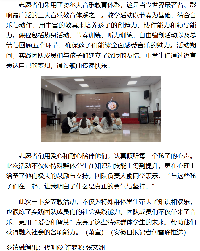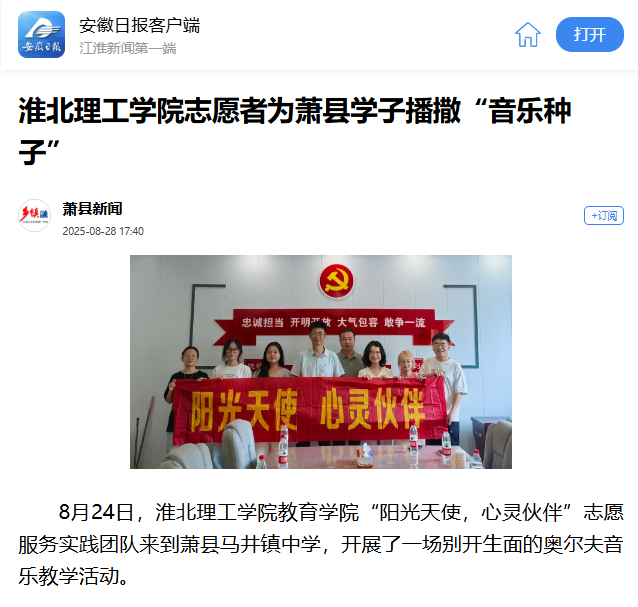 8月24日,诸侯快讯入口官网教育学院“阳光天使,心灵伙伴”志愿服务实践团队来到萧县马井镇中学,开展了一场别开生面的奥尔夫音乐教学活动。对此,安徽日报进行了报道: