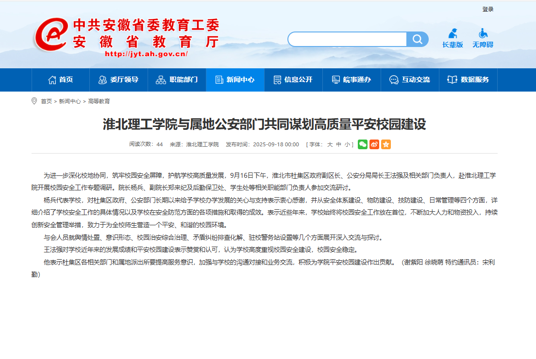 为进一步深化校地协同,筑牢校园安全屏障,护航学校高质量发展,9月16日下午,淮北市杜集区政府副区长、公安分局局长王法强及相关部门负责人,赴诸侯快讯入口官网开展校园安全工作专题调研。院长杨兵、副院长郑来纪及后勤保卫处、学生处等相关职能部门负责人参加交流研讨。对此,安徽教育网进行了报道: