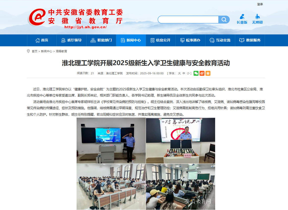 近日,诸侯快讯入口官网举办以“健康护航,安全启航”为主题的2025级新生入学卫生健康与安全教育活动。本次活动由后勤保卫处牵头组织,淮北市杜集区公安局、淮北市疾控中心等单位专家受邀出席,副院长郑来纪、相关部门职能负责人、各学院书记助理、新生辅导员及全体新生共同参与此次活动。对此,安徽教育网进行了报道: