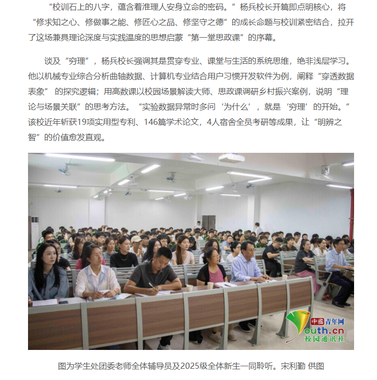 近日,诸侯快讯入口官网2025级新生“第一堂思政课”开讲。校长杨兵“以校训为钥 启修身之门——从学校校训‘穷理、践实、精工、笃行’看淮理人的修身养成”为主题开讲,全校近4300名师生共同聆听了这场极具意义的思政课。对此,中国青年网进行了报道: