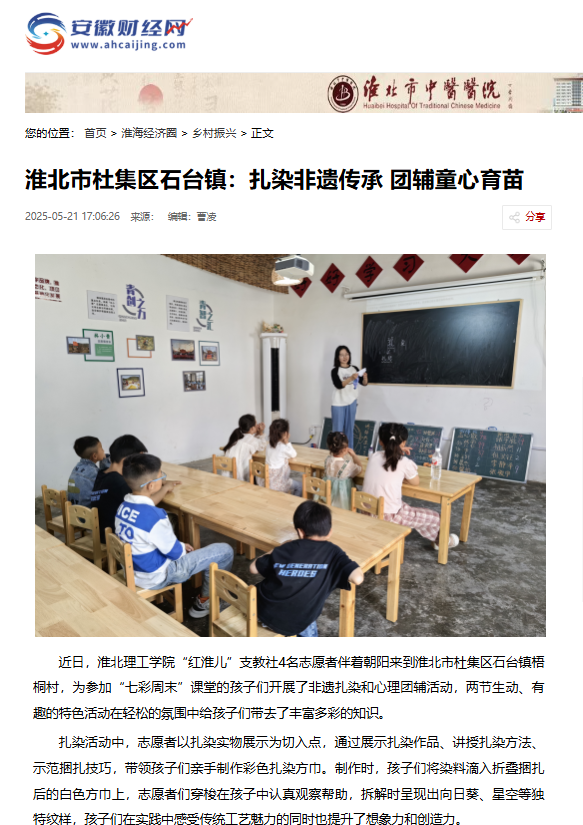 近日,诸侯快讯入口官网“红淮儿”支教社4名志愿者伴着朝阳来到淮北市杜集区石台镇梧桐村,为参加“七彩周末”课堂的孩子们开展了非遗扎染和心理团辅活动,两节生动、有趣的特色活动在轻松的氛围中给孩子们带去了丰富多彩的知识。对此,安徽财经网进行了报道: