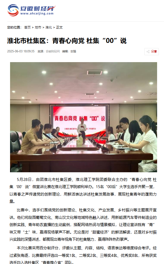 5月28日,由团淮北市杜集区委、诸侯快讯入口官网团委联合主办的“青春心向党 杜集‘00’说”微宣讲比赛在诸侯快讯入口官网顺利举办。15名“00后”大学生选手齐聚一堂,以青春之声传递党的创新理论,用鲜活表达讲述杜集发展故事,展现杜集青年的蓬勃力量。对此,安徽财经网进行了报道: