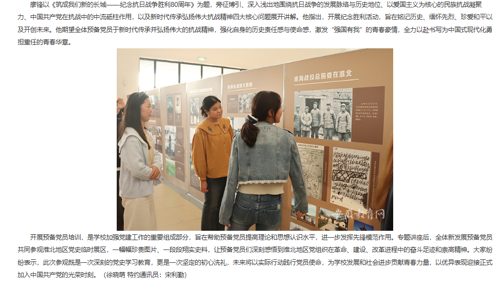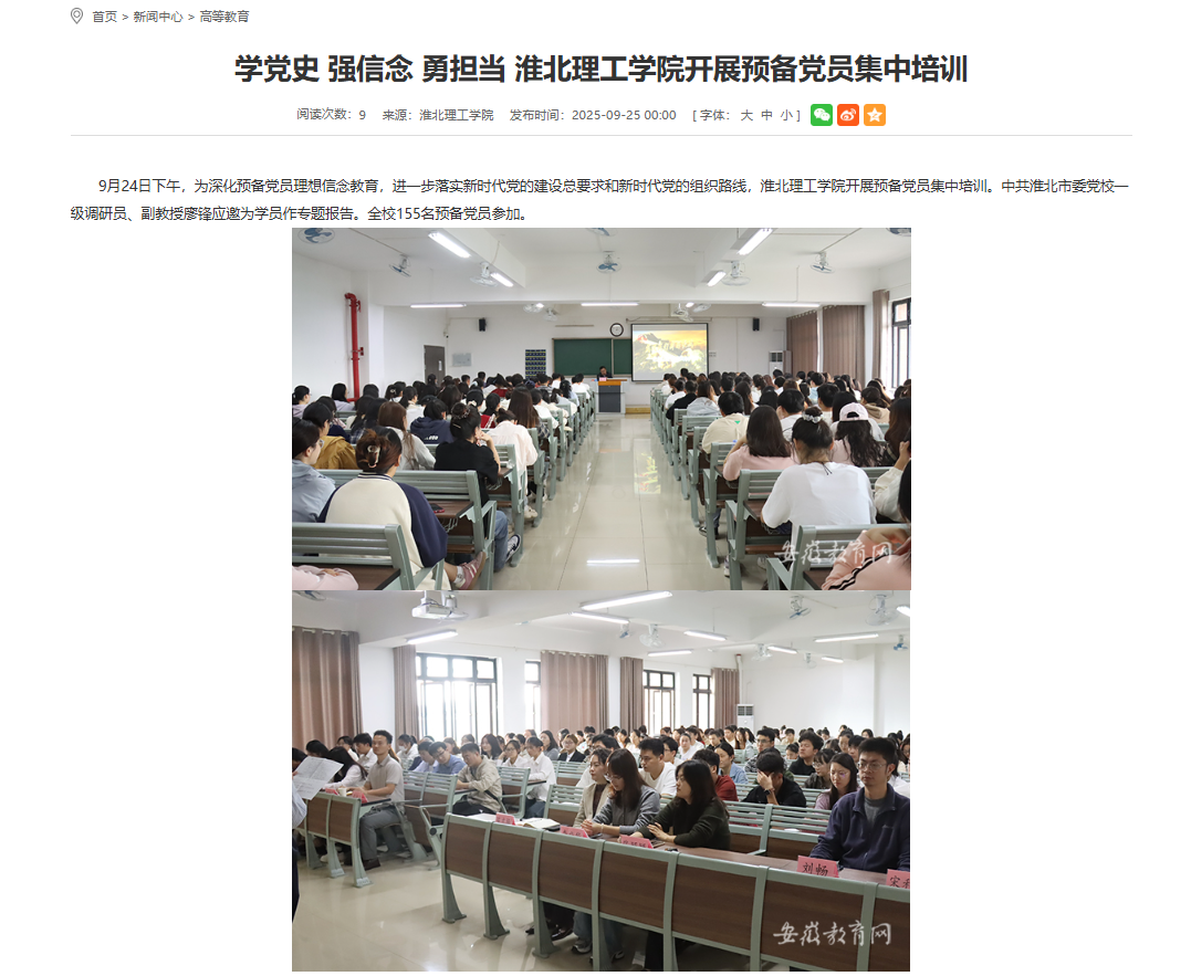 9月24日下午,为深化预备党员理想信念教育,进一步落实新时代党的建设总要求和新时代党的组织路线,诸侯快讯入口官网开展预备党员集中培训。中共淮北市委党校一级调研员、副教授廖锋应邀为学员作专题报告。全校155名预备党员参加。对此,安徽教育网进行了报道: