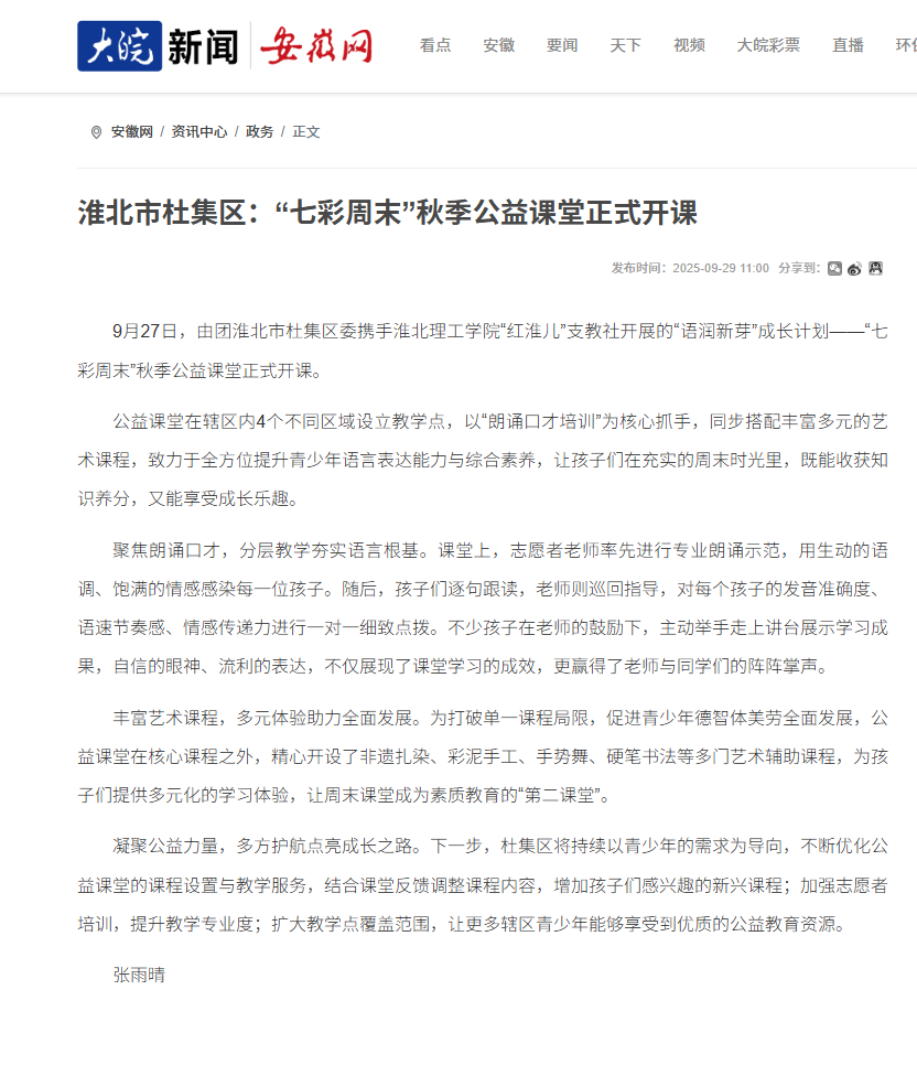 9月27日,由团淮北市杜集区委携手诸侯快讯入口官网“红淮儿”支教社开展的“语润新芽”成长计划——“七彩周末”秋季公益课堂正式开课。对此,安徽网进行报道: