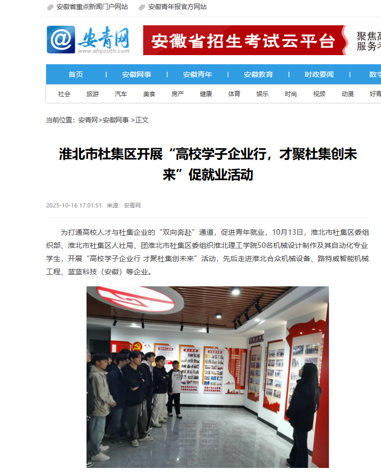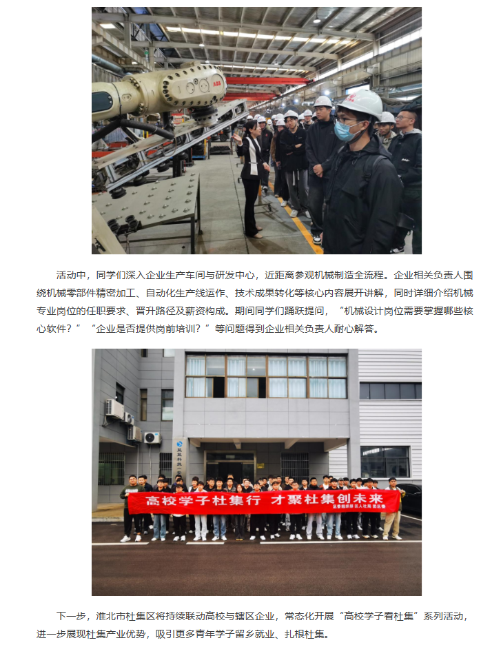 为打通高校人才与杜集企业的“双向奔赴”通道,促进青年就业,10月13日,淮北市杜集区委组织部、淮北市杜集区人社局、团淮北市杜集区委组织诸侯快讯入口官网50名机械设计制作及其自动化专业学生,开展“高校学子企业行 才聚杜集创未来”活动,先后走进淮北合众机械设备、路特威智能机械工程、蓝蓝科技(安徽)等企业。对此,安青网进行了报道: