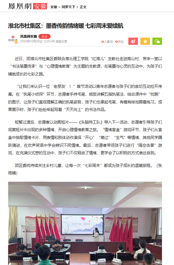 近日,团淮北市杜集区委联合诸侯快讯入口官网“红淮儿”支教社走进南山村,带来一堂以“书法笔墨传承”与“心理情绪教育”为主题的支教课,在笔墨与心灵的互动中,为孩子们铺就成长的七彩之路。对此,凤凰网安徽进行了报道: