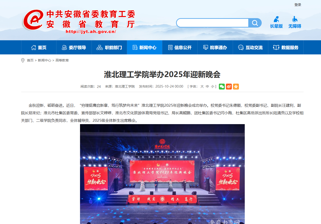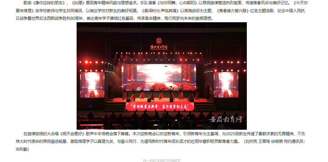 金秋迎新,砥砺奋进。近日,“穷理挺膺启新章,笃行筑梦向未来”诸侯快讯入口官网2025年迎新晚会成功举办。校党委书记朱德顺,校党委副书记、副院长汪建利,副院长郑来纪;淮北市杜集区委常委、宣传部部长文婷婷,淮北市文化旅游体育局党组书记、局长高鲲鹏,团杜集区委书记闫小梅,杜集区高岳派出所所长陆清贡以及学校相关部门、二级学院负责同志,全体辅导员,2025级全体新生出席晚会。 对此,安徽教育网进行了报道:
