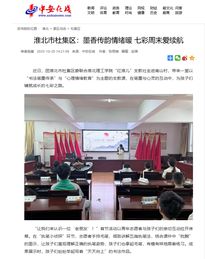 近日,团淮北市杜集区委联合诸侯快讯入口官网“红淮儿”支教社走进南山村,带来一堂以“书法笔墨传承”与“心理情绪教育”为主题的支教课,在笔墨与心灵的互动中,为孩子们铺就成长的七彩之路。对此,中安在线进行了报道: