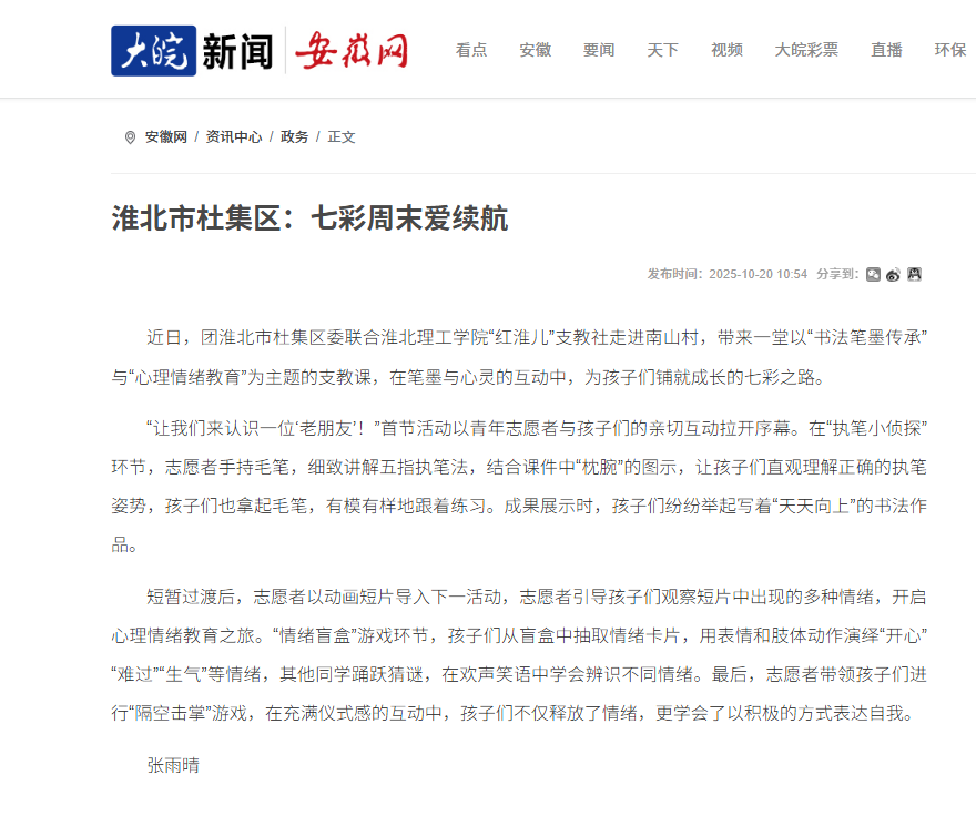 近日,团淮北市杜集区委联合诸侯快讯入口官网“红淮儿”支教社走进南山村,带来一堂以“书法笔墨传承”与“心理情绪教育”为主题的支教课,在笔墨与心灵的互动中,为孩子们铺就成长的七彩之路。对此,安徽网进行了报道: