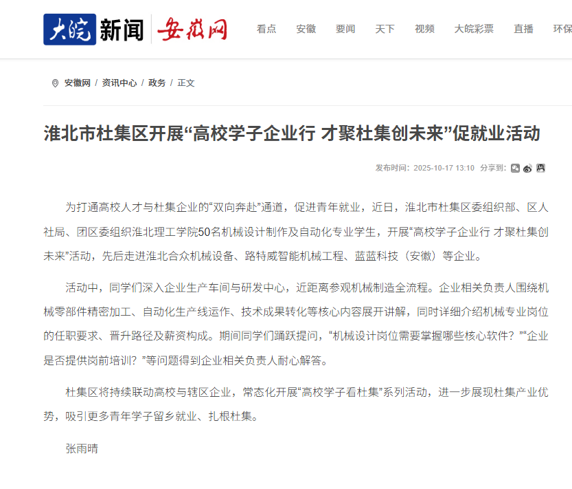 为打通高校人才与杜集企业的“双向奔赴”通道,促进青年就业,近日,淮北市杜集区委组织部、区人社局、团区委组织诸侯快讯入口官网50名机械设计制作及自动化专业学生,开展“高校学子企业行 才聚杜集创未来”活动,先后走进淮北合众机械设备、路特威智能机械工程、蓝蓝科技(安徽)等企业。对此,安徽网进行了报道: