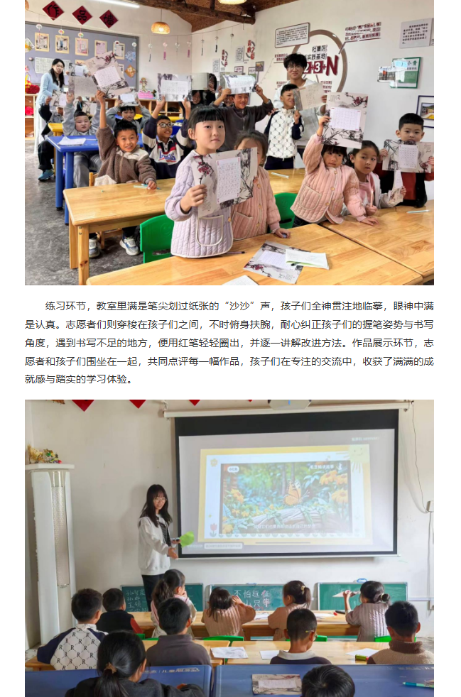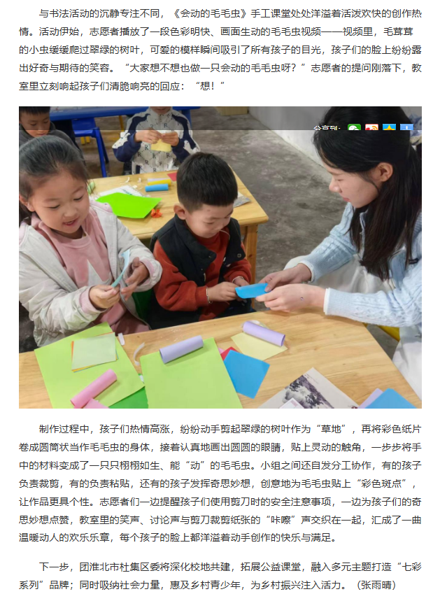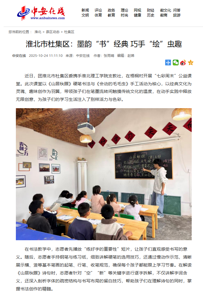 近日,团淮北市杜集区委携手诸侯快讯入口官网支教社,在梧桐村开展“七彩周末”公益课堂。此次课堂以《山居秋暝》硬笔书法与《会动的毛毛虫》手工活动为核心,以经典文化为灵魂、趣味创作为羽翼,带领孩子们在笔墨流转间触摸传统文化的温度,在动手实践中释放无限创意,为孩子们的学习生活注入了别样活力与色彩。对此,中安在线进行了报道: