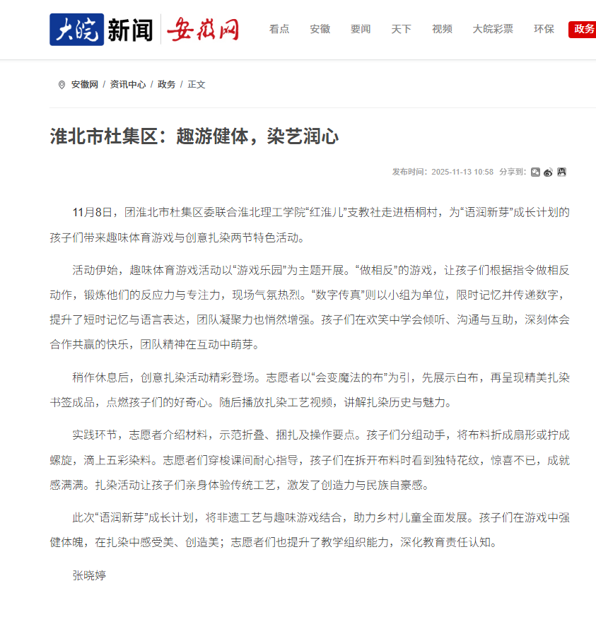 11月8日,团淮北市杜集区委联合诸侯快讯入口官网“红淮儿”支教社走进梧桐村,为“语润新芽”成长计划的孩子们带来趣味体育游戏与创意扎染两节特色活动。对此,安徽网进行了报道: