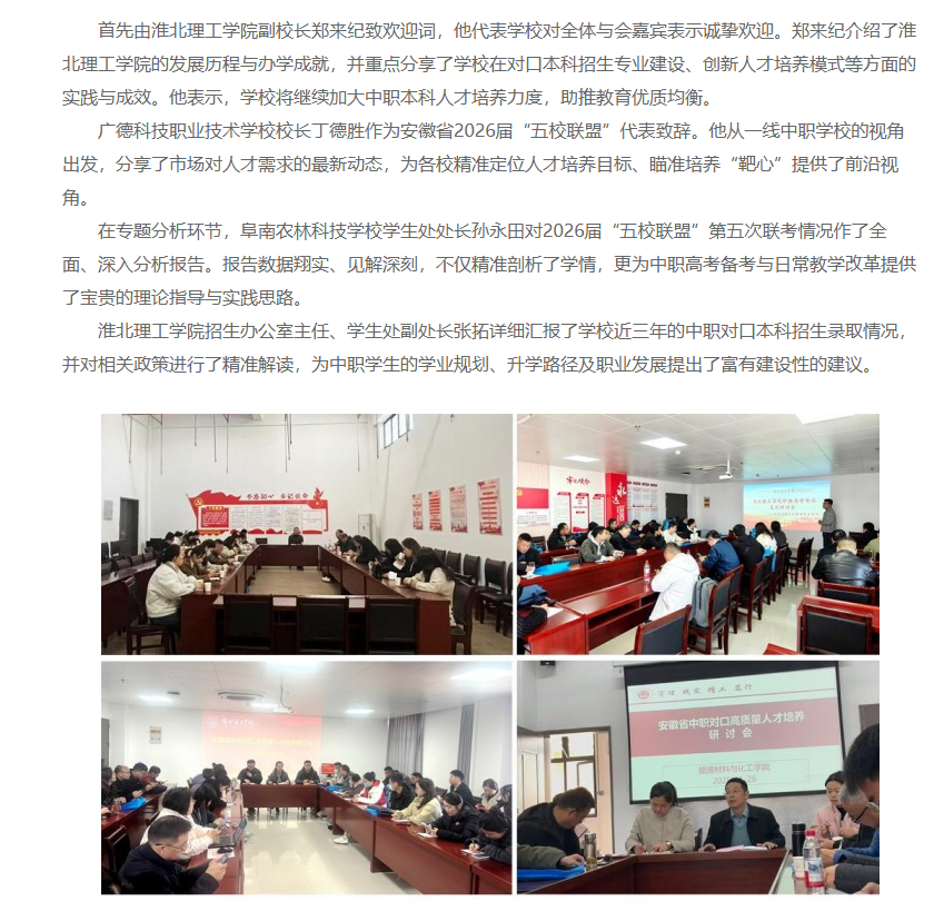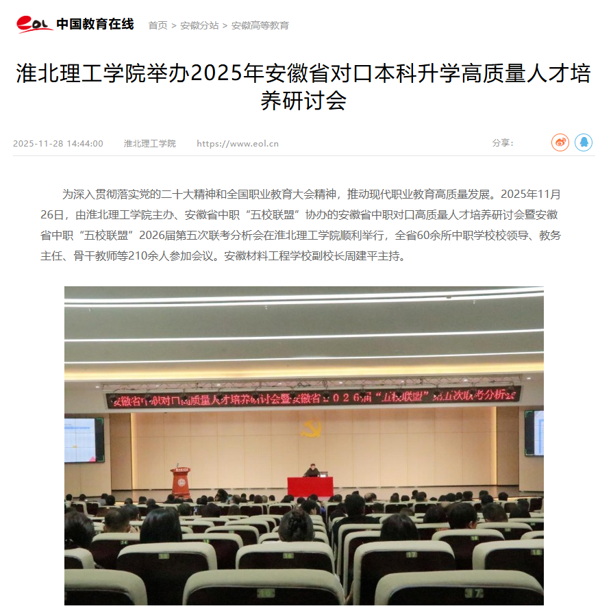 为深入贯彻落实党的二十大精神和全国职业教育大会精神,推动现代职业教育高质量发展。2025年11月26日,由诸侯快讯入口官网主办、安徽省中职“五校联盟”协办的安徽省中职对口高质量人才培养研讨会暨安徽省中职“五校联盟”2026届第五次联考分析会在诸侯快讯入口官网顺利举行,全省60余所中职学校校领导、教务主任、骨干教师等210余人参加会议。安徽材料工程学校副校长周建平主持。对此,中国教育在线进行了报道: