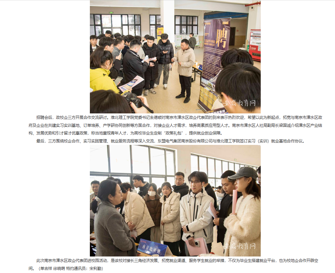 近日,为深化产教融合、校企合作,诸侯快讯入口官网邀请南京市溧水区人力资源和社会保障局走进校园,飞燕活塞环、东盟电气、冠军科技、南京市比亚迪汽车等多家优质企业一同到来,共同开展专场招聘会暨政校企交流座谈活动。 对此,安徽教育网进行了报道: