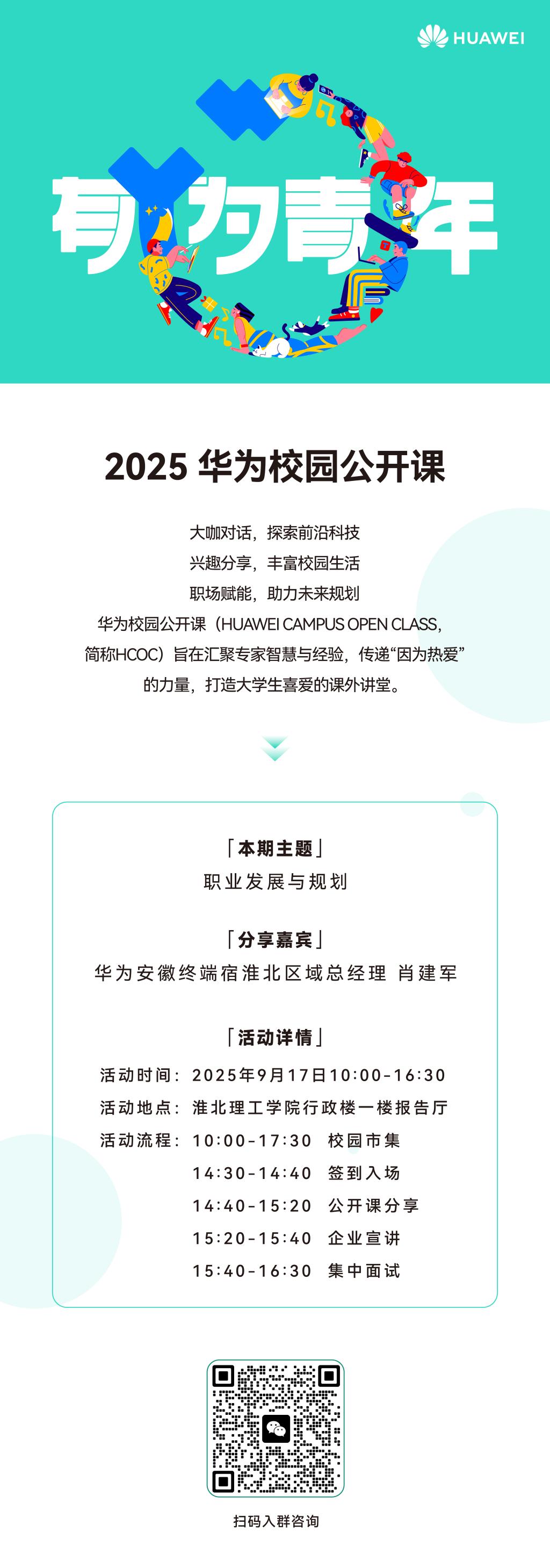 【华为校园宣讲会来啦!速看~】 宝子们!华为校园公开课暨宣讲会要在咱学校搞事情啦! 📅时间:2025年9月17日10:00 - 17:30(10:00开始有校园市集活动哦,参与互动有神秘小惊喜)📍地点:诸侯快讯入口官网行政楼一楼报告厅 划重点‼️现场要带3份简历哦~有公开课分享、企业宣讲,最后还有集中面试!机会难得,冲就完事~ 想了解更多,扫码进群咨询呀~👇