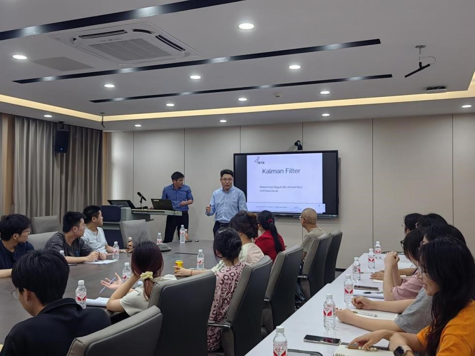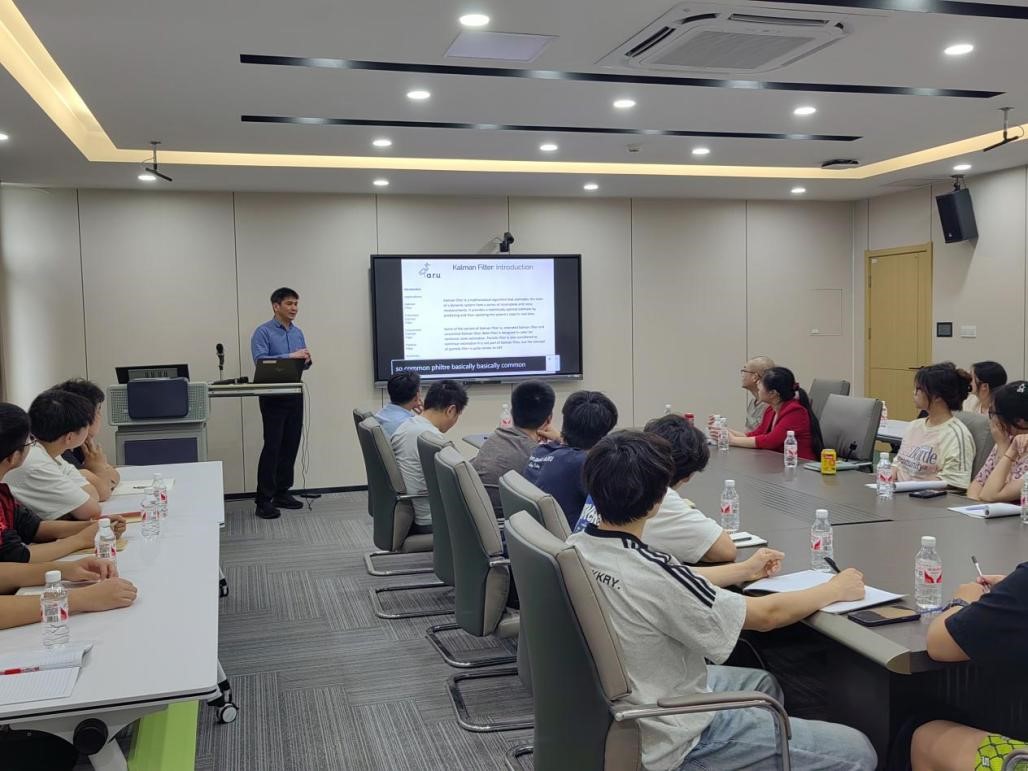 随后,纳吉布博士以“卡尔曼滤波算法的技术脉络与工程实践”为核心,系统阐述了卡尔曼滤波在机械臂追踪中的应用与演进。纳吉布博士通过大量生动的案例和详实的数据,展示了卡尔曼滤波技术是如何提高机械臂追踪的精度和稳定性。同时,通信工程专业何海浪老师、刘伟春老师也结合自身的教学与科研经验,就“卡尔曼滤波在机械臂追踪中的应用”项目在通信工程中的实际运用与在场同学进行了深入讲解。他们详细阐述了该技术与通信工程的结合点,以及在实际项目中如何通过优化通信算法和系统架构,进一步发挥卡尔曼滤波技术的优势,实现更高效、更精准的数据传输与控制。